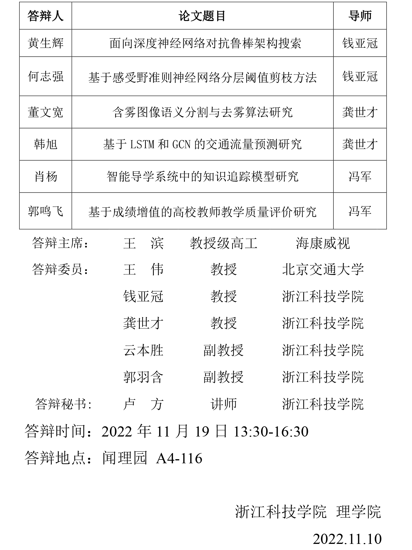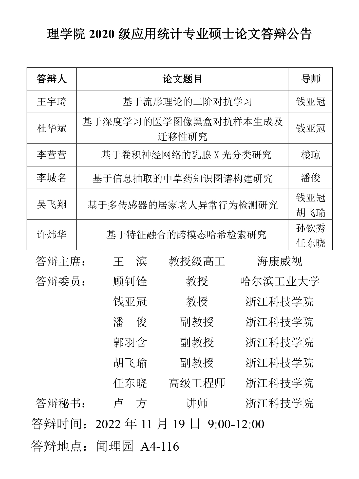 国产自拍 2020级应用统计专业硕士论文答辩公告