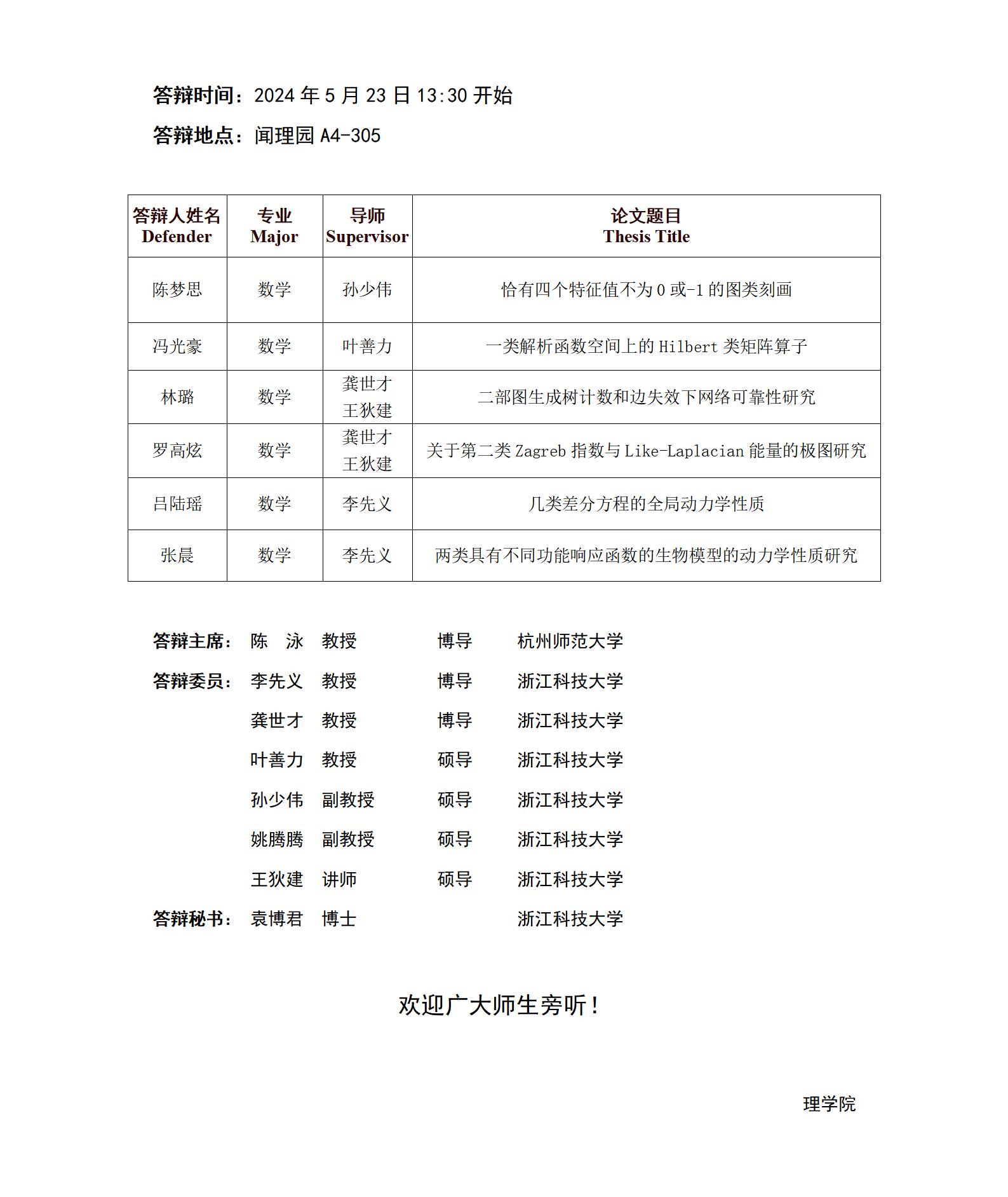 2024年国产自拍 硕士研究生学位论文答辩公告(数学1组)