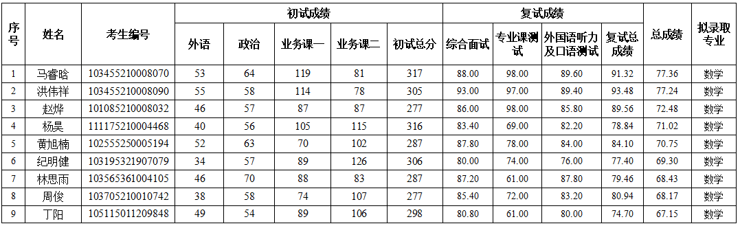 经考生初试、复试等各个环节,国产自拍 招生工作领导小组确认,现对拟录取的考生进行公示(详见下表),公示时间为2025年4月10日至4月16日(7天),如有疑义,请以书面的形式反映,反映问题要实事求是,署本人真实姓名。