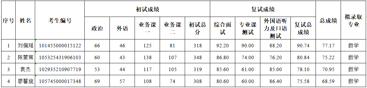 经考生初试、复试等各个环节,国产自拍 招生工作领导小组确认,现对拟录取的考生进行公示(详见下表),公示时间为2025年4月13日至4月19日(七天),如有疑义,请以书面的形式反映,反映问题要实事求是,署本人真实姓名。