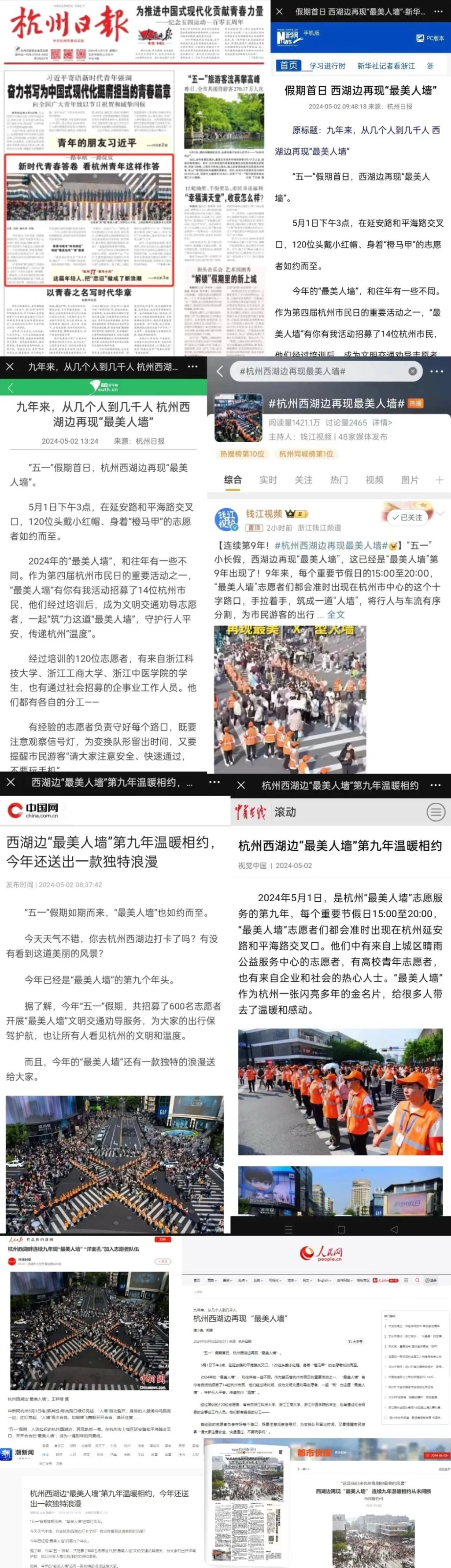 刚刚过去的“五一”小长假,美丽杭州又吸引了来自国内外的众多游客,再次刷新了接待游客的记录。人流如织的西湖边,也再现熟悉一幕。延安路和平海路交叉口,开开合合的“最美人墙”,成为一道靓丽的风景线。理学志愿者们的身影吸引了CCTV、央视网、新华网、人民日报、浙江新闻、杭州日报、中国蓝、潮新闻、钱江晚报等媒体的点赞关注。