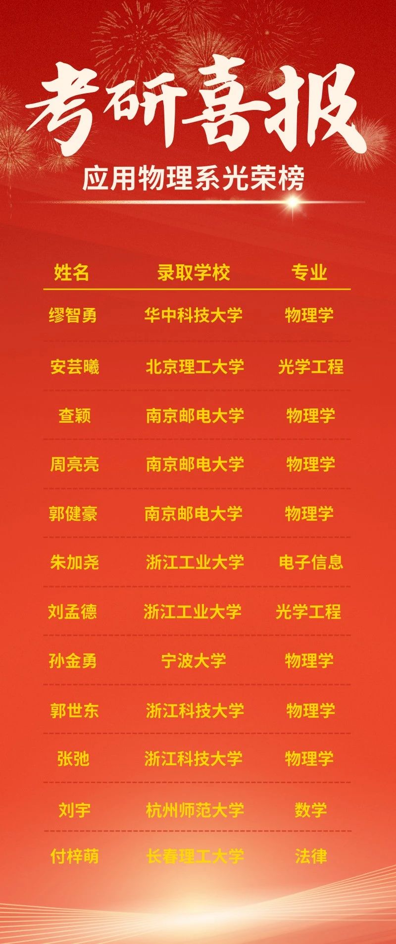 杏坛吐馥结硕果,兰台振翼报佳音。在2025年全国硕士研究生招考中,国产自拍 应用物理系共计12位学子被华中科技大学、北京理工大学、南京邮电大学、浙江工业大学等高校成功录取。(文稿来源:浙科物理)