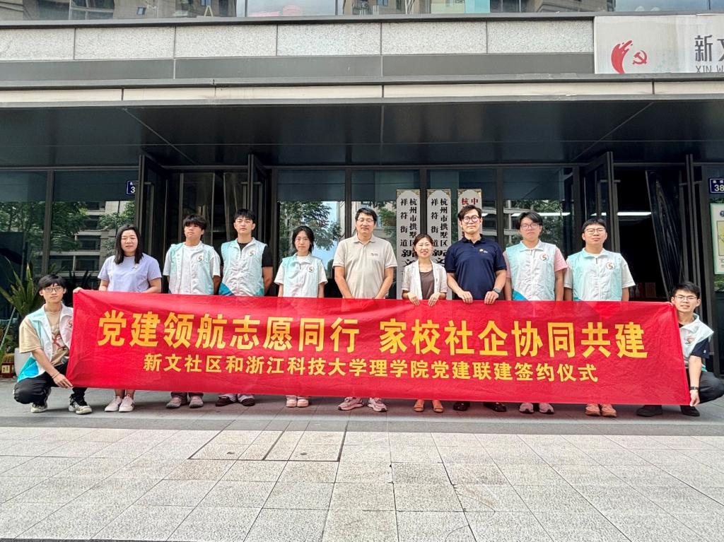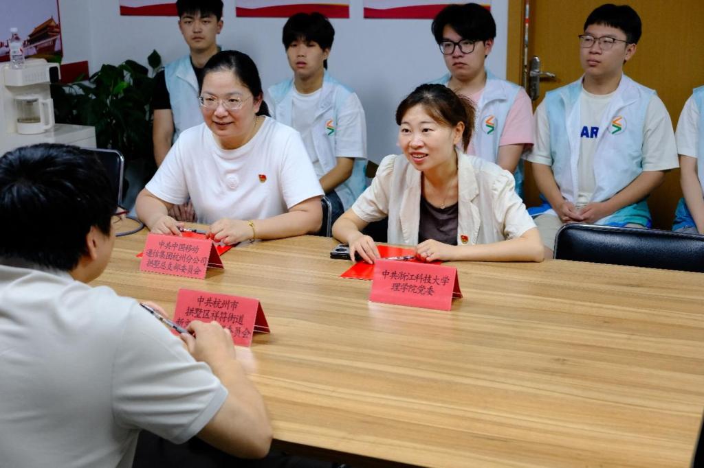 党委副书记沈艳婷与杭州市拱墅区祥符街道新文社区党支部书记沈权、中国移动通信集团拱墅分公司祥和分局支局长王见利,签署党建联建书,旨在加强家校社企多方合力,为国产自拍