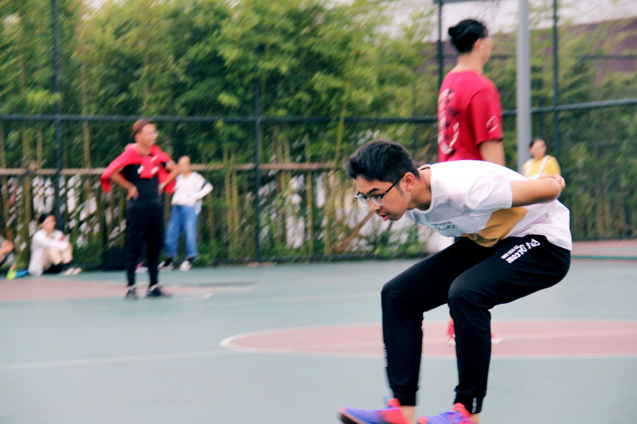每组派四名女生,八名男生上场。各小组分为两队每队各六名同学位于篮球场两侧,用木棍驱赶篮球迎面接力。最终B小组凭借男生的大长腿取得第一名。