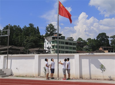 操场进行升旗仪式,全体师生庄重肃穆,共唱国歌。升旗仪式结束后,在国旗下,孩子们宣誓:“继承遗志,发扬传统;茁壮成长,开创未来;锻炼身体,保卫祖国;好好学习,天天向上!”