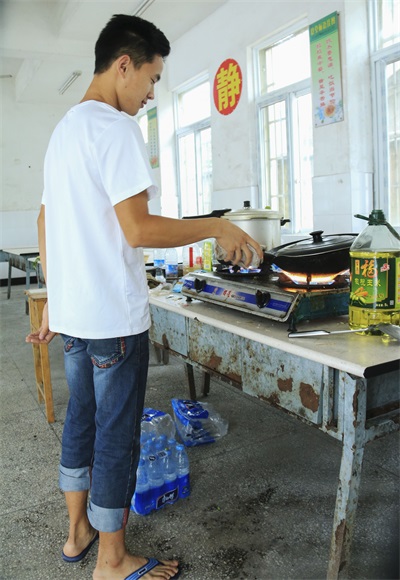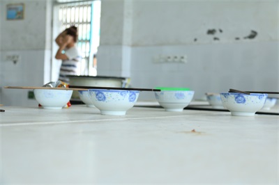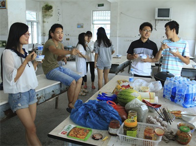 台风来临的第二个早上,眼前出现的一幕让我们惊呆了,前一晚的风雨,使得地势较低的厨房和餐厅被积水淹没,而其他地方,也有较深的积水。没水没电,现在连厨房都不能使用了,我们的实践活动竟然面临了生存的挑战。不过,我们都在积极地想办法去解决眼前的困难,将厨房的煤气瓶和煤气灶搬了出来,拿了一些没有被水泡坏的菜,还去小店买了一些泡面和其他食物,勉强地度过了两天半的艰难日子。
