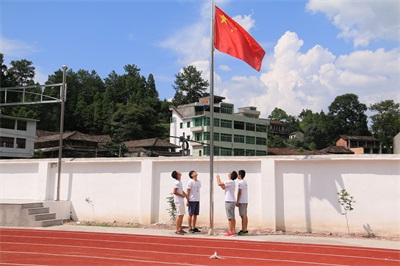 操场进行升旗仪式,全体师生庄重肃穆,共唱国歌。升旗仪式结束后,在国旗下,孩子们宣誓:“继承遗志,发扬传统;茁壮成长,开创未来;锻炼身体,保卫祖国;好好学习,天天向上!”