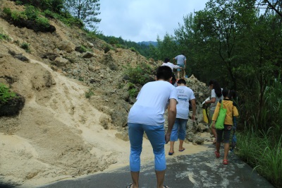 大门外传来了熟悉的声音。天空还下着小雨,可是一把把雨伞下,孩子们竟满是愉悦的笑脸,开口的第一句话竟然是“老师,可以把教室的门打开上课吗?”雨下的队员们眼眶微红,但是感动之余队员们更加关心孩子们的安全。台风刚过,山路泥泞,滑坡频发,孩子们来回的路上会遇到怎样的危险,队员们想都不敢想。反应过来的队员们忍痛拒绝了上课的请求,而是马上组织人员送孩子们回家。在送孩子们回去的路上,一处道路因为泥石流滑坡已经封锁了道路,巨大的缺口依然散发着危险的气息。“孩子们是怎么过来的?”队员们再一次被孩子们的执着感动,这是一群多么天真,多么可爱的“小妖精”。