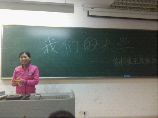 2012年11月4日星期日晚18:30,信计123班在图书馆西楼210教室举行了以“我们的大学”为主题的班会,班主任李蔚参加了班会。