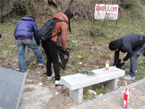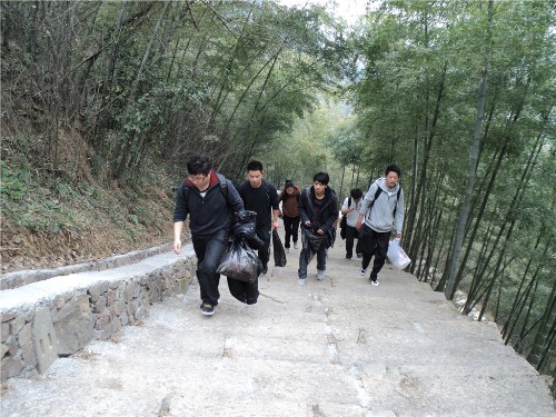 虽然没有小旗子在前面带队,但我们一样充满精神,分工明确;虽然我们没有专业的登山装备,但我们一样努力给大山除去污点;虽然我们没有大队的人马,没有响亮的口号,但我们踏踏实实的做事。路上的行人用赞扬的目光看着我们,亲切的问我们是什么国产自拍