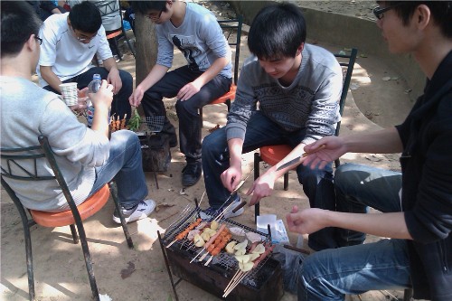 在走马观花之后,我们来到了此行的目的地——桃花源烧烤。来这里之前,我们就去大量采购了食物。其实一开始的生火就是难题,结果还是在一位经验丰富的老奶奶帮助下,生起了火。大部分同学都是第一次烤,但是大家都是烧烤的能手,出来的食物是有模有样的,很好吃。
