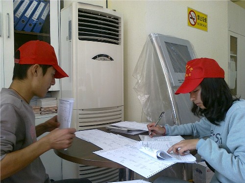 早上8点30分,分队队长带领队员乘坐校车到达各自所在社区。在这微凉的天气里,志愿者们都拿出了饱满的热情,去迎接一天的工作。社区工作人员分配任务并进行细心的工作指导之后,各组志愿者相继出发,身着黄色马夹,头戴小红帽,踏上上门普查之路,主要进行户主信息核实工作。从储藏室到沿街商铺,从居民楼一楼到七楼,每个角落都留下了志愿者的脚印。大部分居民对志愿者的上门表示理解,很配合工作,极小部分因为隐私或其他原因不肯配合的,经过社区工作人员协调后也都使得我们的工作顺利进行。其他志愿者则留在办公室进行资料整理,一项项仔细对照信息,工整地抄写长短表。还有部分志愿者负责电脑录入,电话预约工作,大家分工合作,井然有序。社区工作人员对我们的工作相当满意,同时也对我们浙江科技国产自拍
