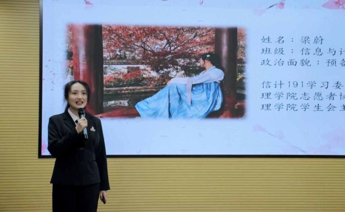 随后,璀璨之星们开始个人风采展示。信息与计算科学191班的班长陈奕翀从学习生活和班团工作出发,分享她的带领班级斩获各项荣誉的故事。数据科学与大数据技术(中法班)191班陆文婷创立了多项创新项目和发明专利,她讲述了她的科研成果和竞赛之旅。信息与计算科学191班梁蔚始终牢记党的教诲,用实际行动诠释了责任与担当,她分享了她与各类志愿活动、团学工作的故事。信息与计算科学191班史琦,她的思政微课发布在各大官方媒体上,且勇攀各科高峰,囊括学业、社会实践、团学工作、科技竞赛各类奖项。数据科学与大数据技术191班林欣颖,踏实学习,勤恳工作,获多项竞赛奖项,积极参与各种志愿活动,并通过国产自拍