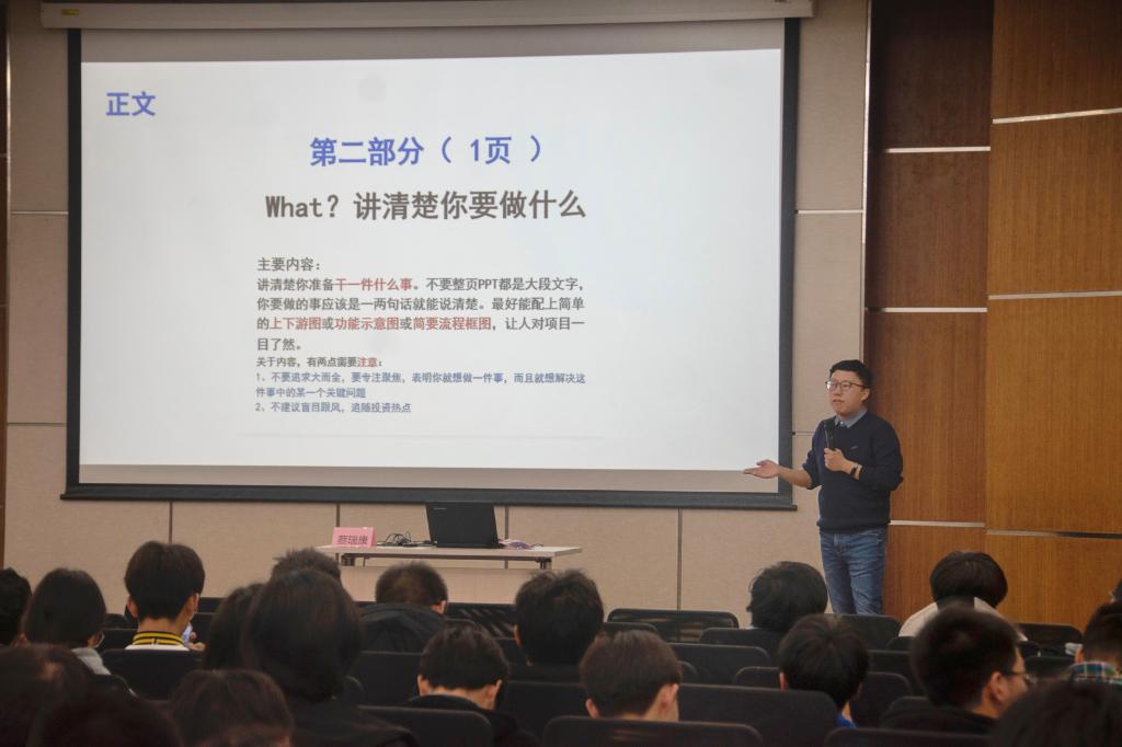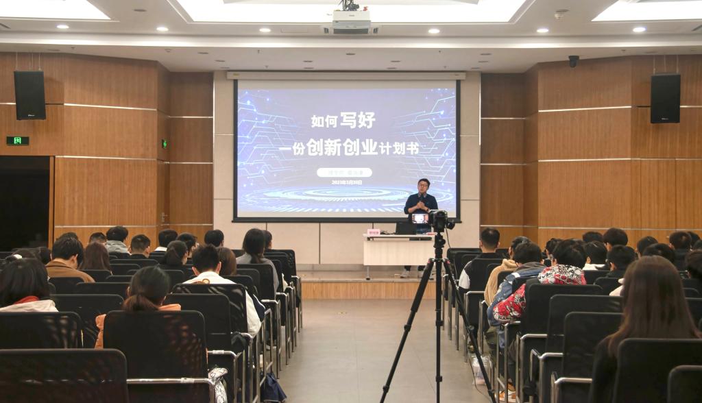 往届学生参赛获奖情况后指出,写好一份创新创业计划书,首先要充分了解市场现状和行业背景,其次在创业计划书中要讲清楚自己项目的研究方向和创新内容,并要从“发现痛点、用户研究、竞品分析、商业模式、产品研发、项目团队、财务预测与融资计划”等方面作详细介绍。
