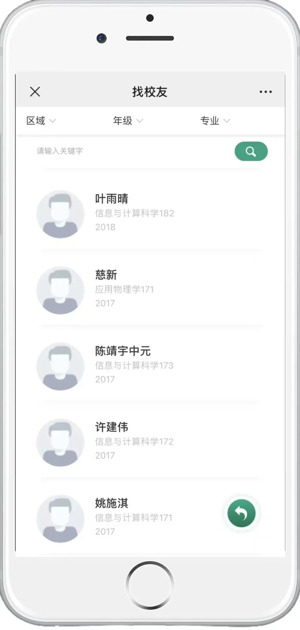 认证完成后,就可以开始找你的校友啦,点击“找校友”,点击上方区域、年级、专业,开启寻找校友之旅吧!