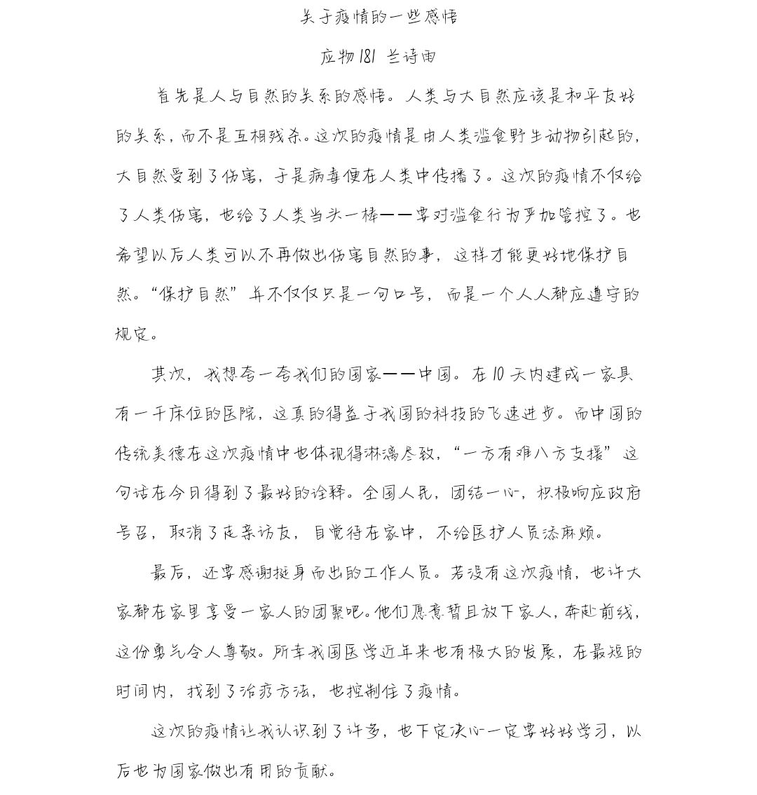 3月10日下午,应用物理学181团支部开展了线上团日活动视频会议。会议中,团支书介绍了实时疫情和防疫措施,同时对“停课不停学”的线上教学模式展开讨论,同学们积极反馈,并相互督促做好时间管理,抓好课业学习。应物181团支部进行的抗疫作品征集活动,以文章等形式表达了对抗疫工作者的敬佩和感谢,用文字书写同学们众志成城、齐心协力抗击疫情的信心和决心。