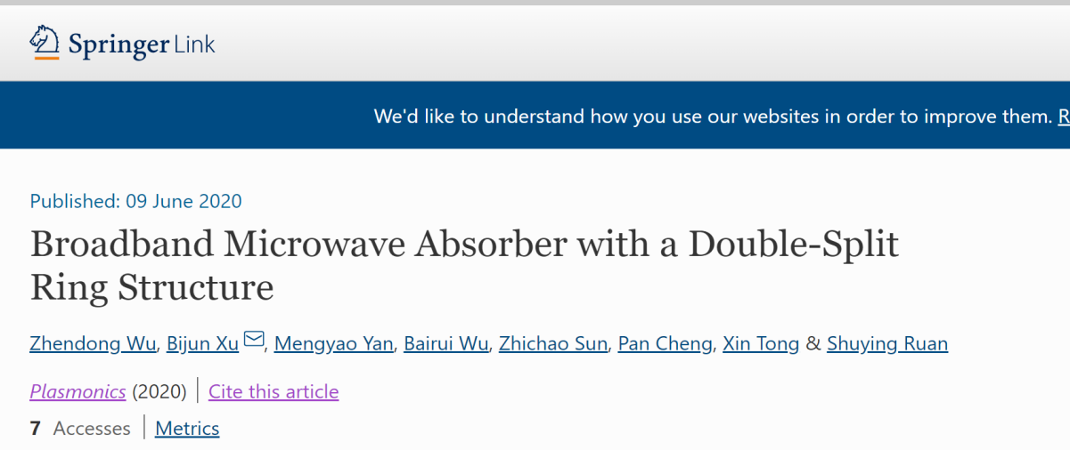 近日, 2017级应用物理学本科生吴震东同学在徐弼军老师指导下以第一作者身份在国际知名期刊《Plasmonics》(IF=2.926,中科院三区)发表了一篇高质量学术论文,这是他们在超材料的吸收损耗特性最新研究成果。论文的通讯作者是徐弼军教授,并以浙江科技国产自拍