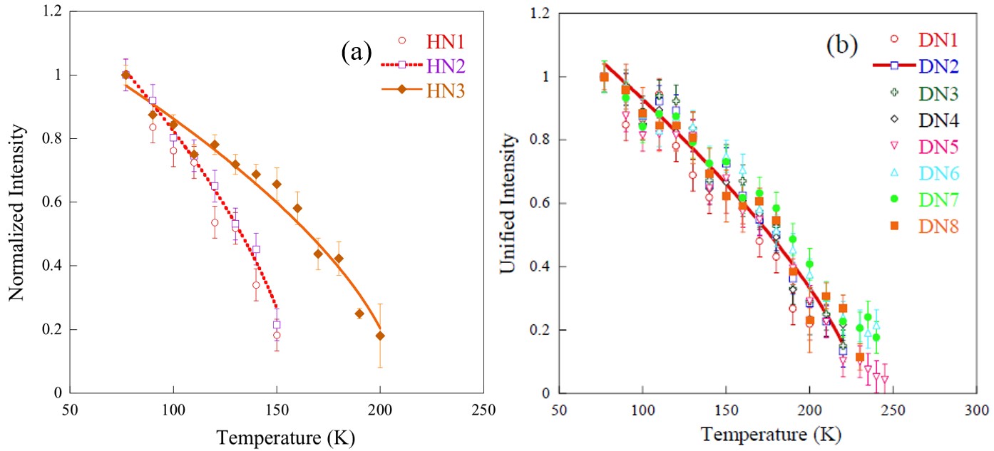 图(3).质子/重氢原子核的波动率 图(4).拉曼附加振动模式的强度与温度依赖关系