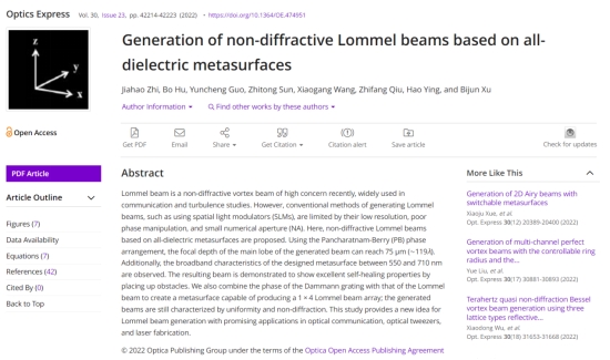 徐弼军教授指导的应用物理系2021级研究生职佳浩同学以第一作者身份在美国光学学会旗下(OSA)著名学术期刊《Optics Express》(影响因子3.894,JCR一区,中科院二区)上发表了题为“Generation of non-diffractive Lommel beams based on all-dielectric metasurfaces”的研究论文,浙江科技国产自拍