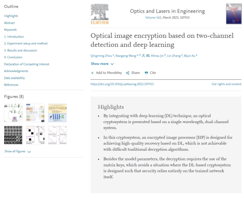 光子与光场调控及应用研究团队汪小刚教授指导的应用物理系2021级研究生周清明同学以第一作者身份在光学工程领域著名学术期刊《Optics and Lasers in Engineering》(影响因子5.666,JCR一区、中科院二区)上发表了题为“Optical image encryption based on two-channel detection and deep learning”的研究论文,浙江科技国产自拍