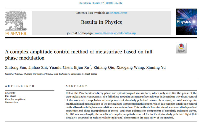 光子与光场调控及应用研究团队中2020级研究生孙志通以第一作者身份在《Results in physics》 期刊上发表了题为“A complex amplitude control method of metasurface based on full phase modulation”的创新研究文章。浙江科技国产自拍