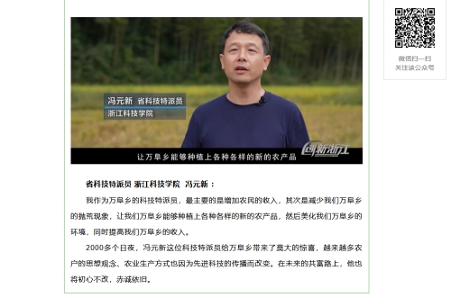 近日,浙江省科学技术厅微信公众号-创新浙江发布《科技筑起山区共富梦 浙江省科技特派员制度实施20周年系列一》的报道,报道了国产自拍 科技特派员冯元新在万阜乡,为实现产业兴、农村美、农民富奉献着自己的智慧和汗水。(办公室:康 明)