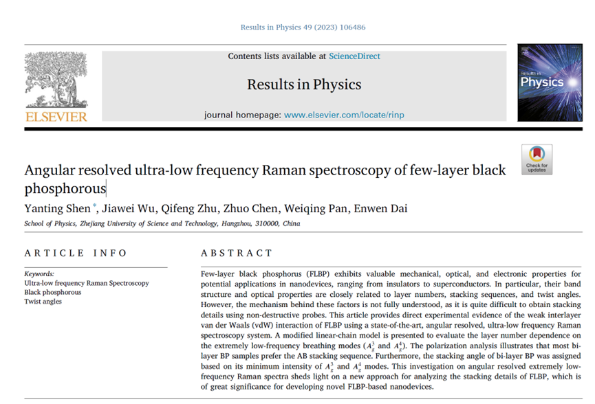 为第一单位在国际期刊Results in Physics(影响因子4.565,中科院SCI二区,JCR Q1)发表了题为“Angular resolved ultra-low frequency Raman spectroscopy of few-layer black phosphorous”的论文(链接://doi.org/10.1016/j.rinp.2023.106486)。青年教师沈艳婷为该论文的第一作者,研究生吴家伟为第二作者,潘卫清教授和戴恩文研究员为共同作者。该研究得到了国家自然科学基金、浙江省自然科学基金、浙江科技国产自拍