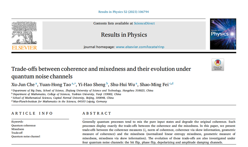 中法大数据2020级本科生车徐骏以第一作者身份在《Results in physics》期刊上发表了题为“Trade-offs between coherence and mixedness and their evolution under quantum noise channels”的科研文章。《Results in physics》是ELSEVIER旗下中科院分区SCI二区期刊。浙江科技国产自拍
