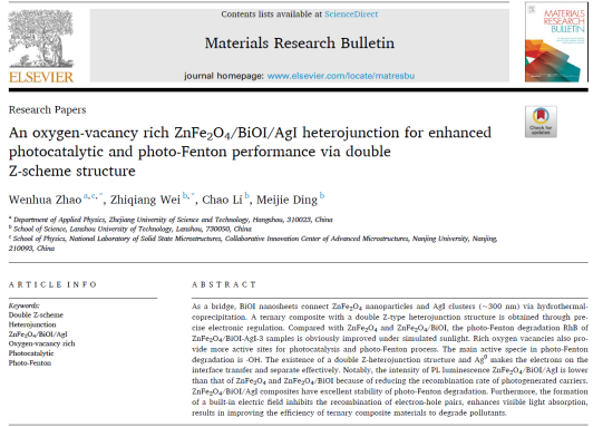 量子关联物质研究团队在“能源材料光催化降解污染物”研究中取得重要进展,研究成果以论文形式发表在国际期刊《Materials Research Bulletin》上(IF: 5.4,中科院二区),论文题目为“An oxygen-vacancy rich ZnFe2O4/BiOI/AgI heterojunction for enhanced photocatalytic and photo-Fenton performance via double Z-scheme structure”。青年博士赵文华为该论文的第一作者和通讯作者,浙江科技国产自拍