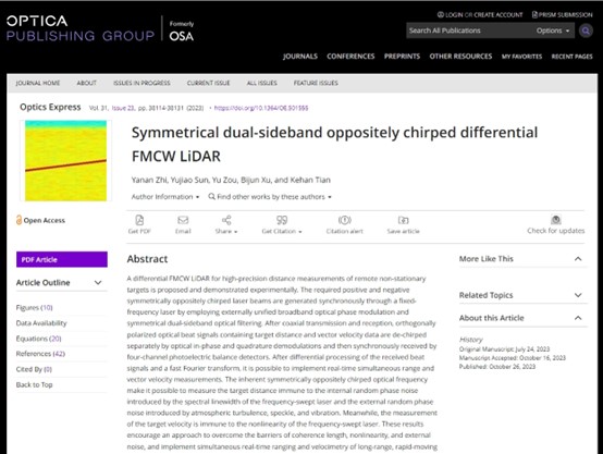 应用物理系光子与光场调控研究团队在FMCW激光雷达研究方面取得重要进展,相关研究成果以论文形式发表在国际光学领域知名期刊《Optics Express》(影响因子3.8,中科院SCI二区,JCR Q1)上。论文题为“Symmetrical dual-sideband oppositely chirped differential FMCW LiDAR”,职亚楠为论文第一作者/通讯作者,研究生孙玉娇为第二作者,浙江科技国产自拍