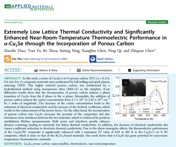 量子关联物质研究团队青年博士赵小蝶在半导体热电材料领域取得重要进展,研究成果发表在《ACS Applied Materials & Interfaces》(IF=9.5,中科院二区TOP),论文题目为“Extremely Low Lattice Thermal Conductivity and Significantly Enhanced Near-Room-Temperature Thermoelectric Performance in α-Cu2Se through the Incorporation of Porous Carbon”。国产自拍
