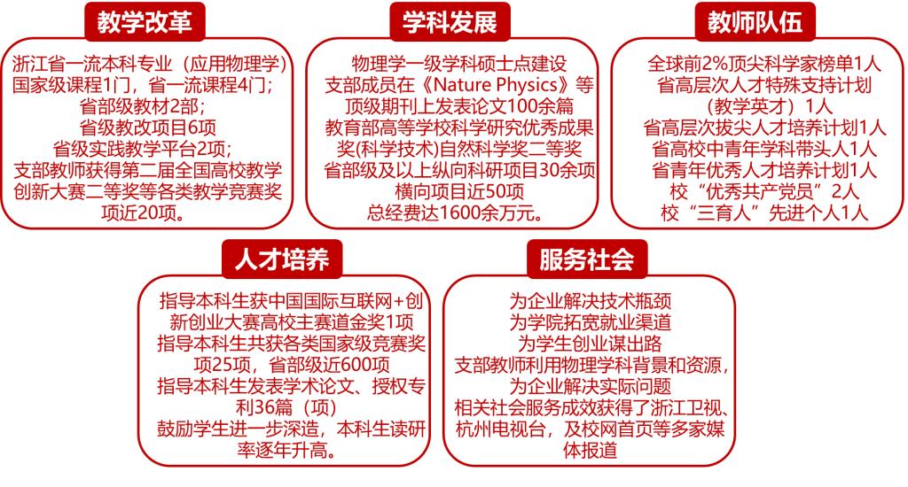 近年来,应用物理系党支部建设在推动教学改革、学科发展、人才培养、社会服务等方面取得了明显成效: