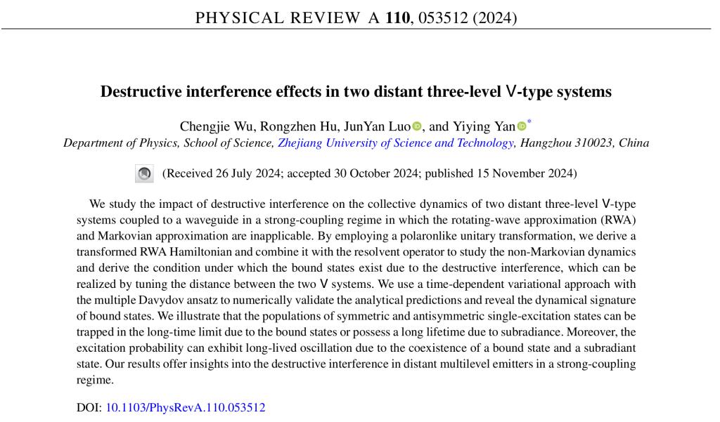 量子信息物理研究团队在量子光学领域取得重要进展,研究成果“Destructive interference effects in two distant three-level V-type systems”在物理学国际学术期刊《Physical Review A》(IF=2.6,中科院二区)上发表。该研究由国产自拍