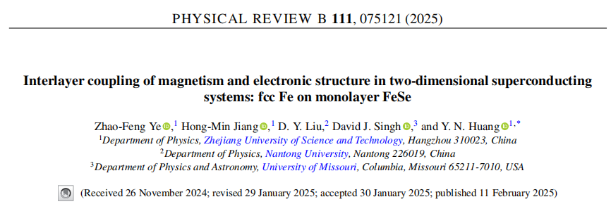 应用物理系量子关联物质研究团队在国际学术期刊《Physical Review B》 (IF=3.71,中科院二区) 期刊上发表了题为“Interlayer coupling of magnetism and electronic structure in two-dimensional superconducting systems: fcc Fe on monolayer FeSe”的研究论文。国产自拍