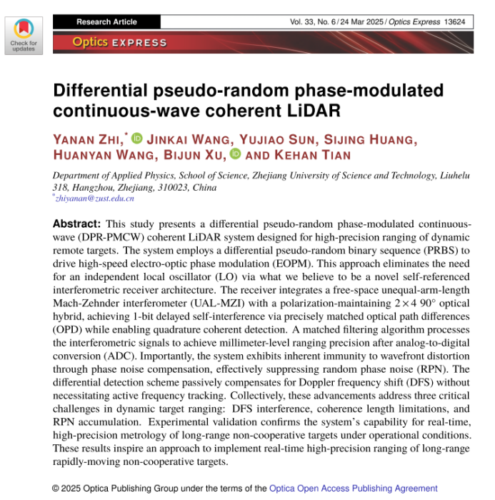 应用物理系光子与光场调控研究团队在相干激光雷达研究方面取得重要进展,相关研究成果以研究论文形式发表在国际光学领域知名期刊《Optics Express》上。论文题为“Differential pseudo-random phase-modulated continuous-wave coherent LiDAR”,全文23页,附图11张,约3.3万字。职亚楠副研究员为论文第一作者/通讯作者,研究生王金凯为第二作者,其他作者依次是孙玉娇、黄思婧、王欢颜、徐弼军教授和田克汉教授,国产自拍