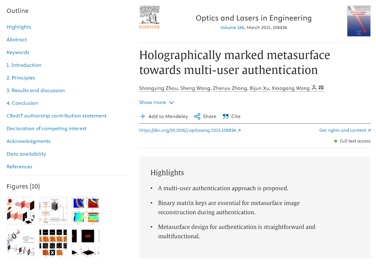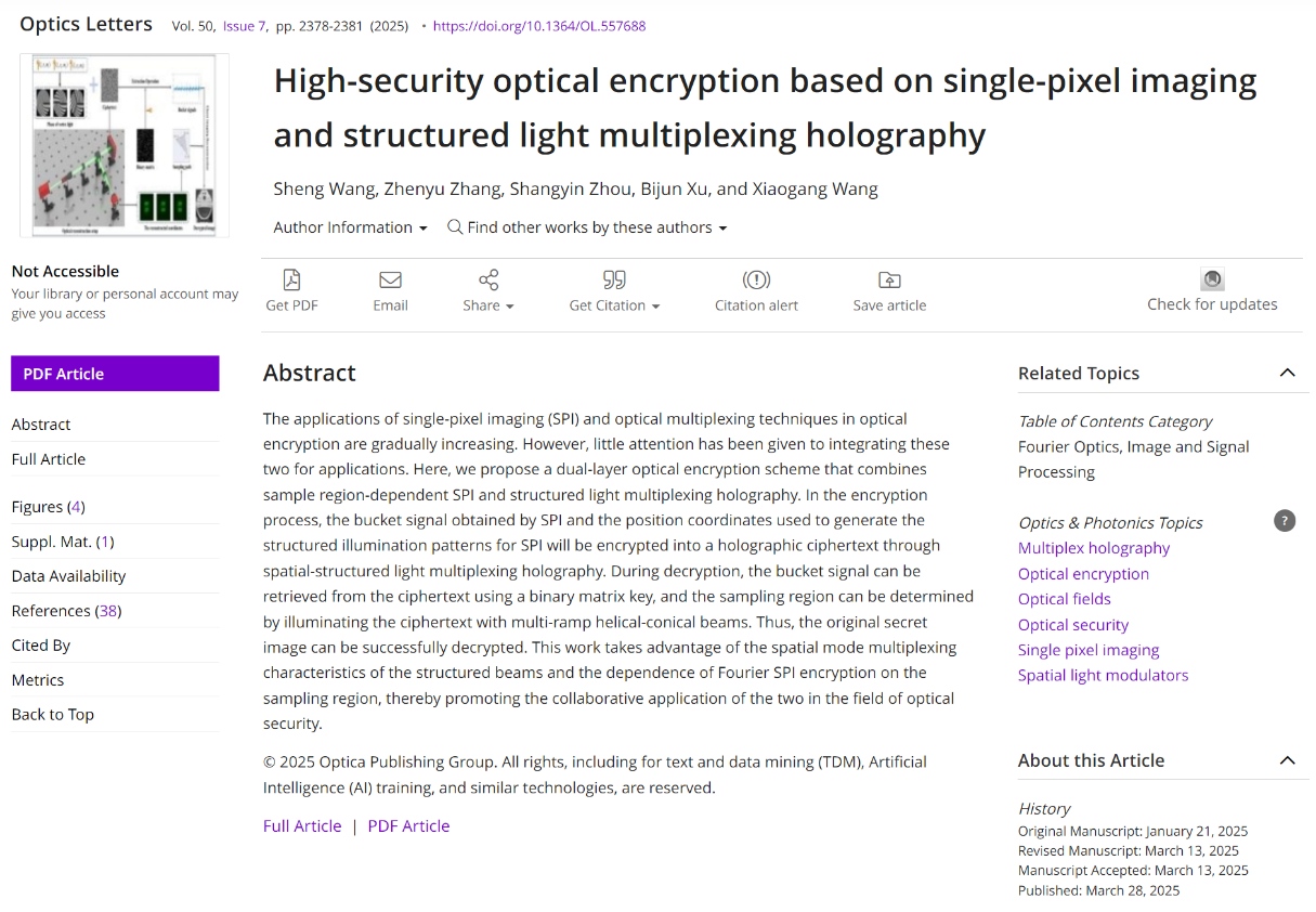 光子与光场调控研究团队汪小刚教授的指导下,应用物理系2022级研究生汪晟同学以第一作者的身份,在光学领域著名学术期刊《Optics Letters》(影响因子3.1,JCR一区、中科院二区)发表了题为“High - security optical encryption based on single-pixel imaging and structured light multiplexing holography”的研究论文。同期,应用物理系2022级研究生周尚营同学也以第一作者身份,在工程技术领域知名学术期刊《Optics and Lasers in Engineering》(影响因子3.5,JCR一区、中科院二区)发表了题为“Holographically marked metasurface towards multi - user authentication”的研究论文。以上两篇论文的第一署名单位均为国产自拍