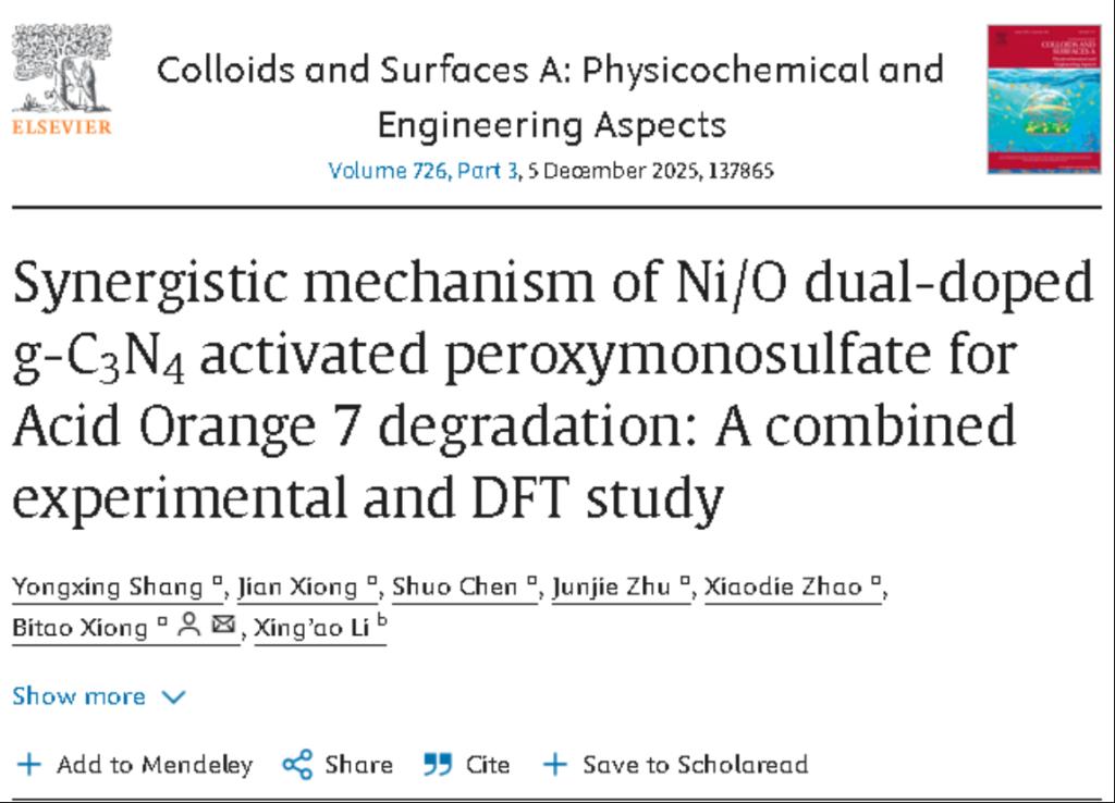 应用物理2022级本科生商永兴以第一作者身份在《Colloids and Surfaces A: Physicochemical and Engineering Aspects》期刊上发表了题为“Synergistic mechanism of Ni/O dual-doped g-C3N4 activated peroxymonosulfate for Acid Orange 7 degradation: A combined experimental and DFT study”的科研文章。国产自拍