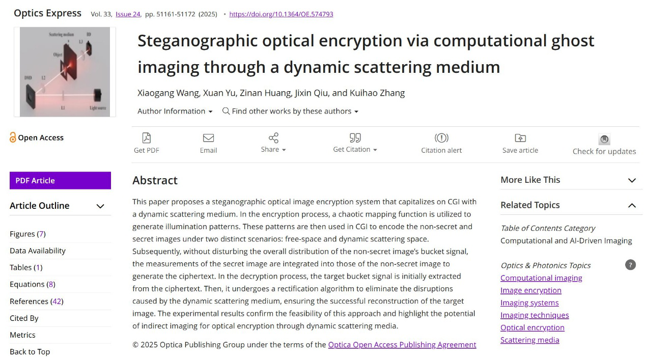 同期,光子与光场调控研究团队在光学领域知名学术期刊《Optics Express》(影响因子3.3,JCR一区、中科院二区)发表了题为“Steganographic optical encryption via computational ghost imaging through a dynamic scattering medium”的研究论文。该成果提出了一种利用动态散射介质结合计算鬼成像的隐写式光学加密系统。加密过程中,分别在自由空间和动态散射空间两种场景下对非秘密图像和秘密图像进行编码。接着,在不干扰非秘密图像桶信号整体分布的前提下,将秘密图像的测量数据融入非秘密图像的测量数据中,从而生成密文。解密阶段,先从密文中提取目标桶信号,再通过校正算法消除动态散射介质造成的干扰,确保目标图像成功重建。实验结果验证了该方法的可行性。该工作凸显了基于动态散射介质的间接成像技术在光学安全领域的应用潜力。国产自拍