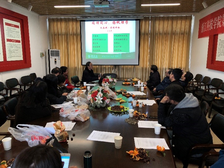 接着,我们邀请了刚刚退休的王长荣教授做了一场教学研讨交流会。王老师用一首自己写的“忆秦娥·退休抒怀”的诗词和大家分享了他从教四十年来的心得和体会,“学高为师,身正为范”,王老师提醒老师不仅要知识广博,也要品格高尚,如此才能彰显出一种作为教师应具有的人格魅力;他还鼓励青年教师要做到与时俱进,博学进取,营造出严谨务实的研究氛围,不断提高自身的教学实践能力和研究能力。