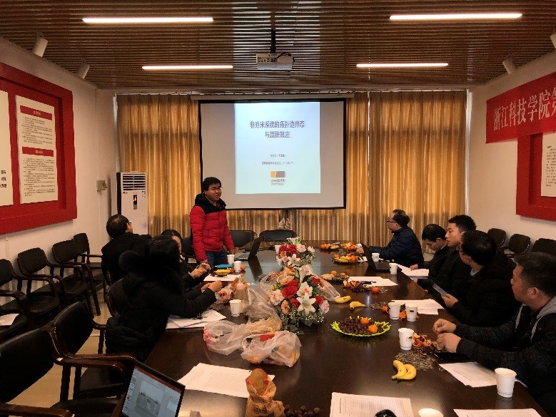 活动的第一部分是学术交流会, 首先吴俊老师做了题为“基于微纳结构的增强吸收效应及其应用”的报告,接着孙婷婷老师介绍了“RNA分子共转录折叠动力学行为研究”,随后王海龙老师介绍了“非厄米系统的拓扑边界态与趋肤效应”,最后戴恩文老师给大家介绍了“激光雷达在声音侦听和振动测量中的应用”,老师们对这些报告都很感兴趣,会上积极与各位作报告的老师进行探讨交流,现场气氛浓厚。
