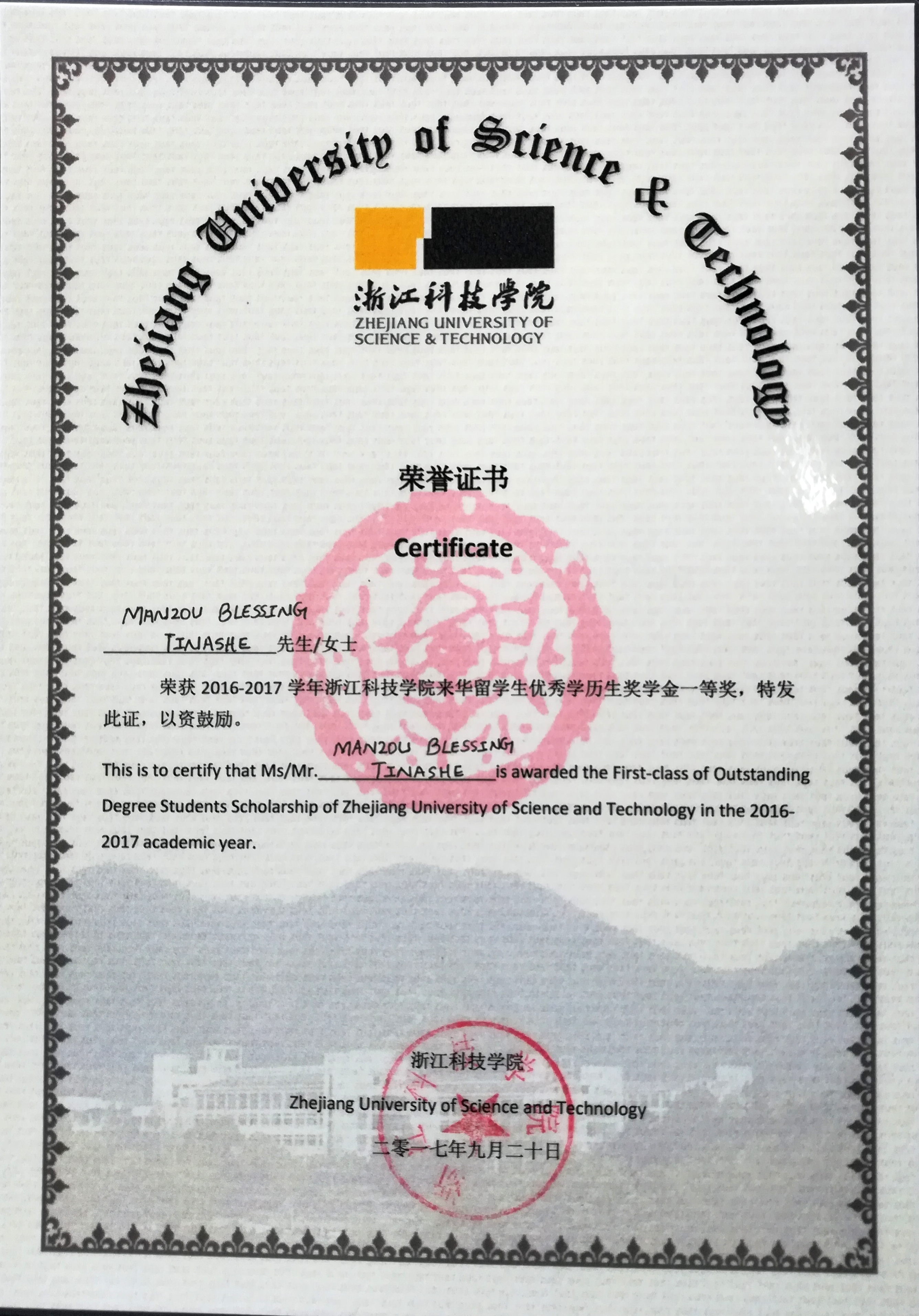 大学里他主修数学和统计学,并享受津巴布韦政府奖学金,因奖学金只能够学费,所以每逢假期,他都会做一些兼职工作,以支付食宿及日常开支。知道他是一个出身寒门又勤奋好学的学生,当地的商人也都自愿给他提供工作,并对他的工作给予很高的赞赏。有心就有路,通过四年的努力,在2014年毕业之时,他取得了数学和统计学的二等双学位。