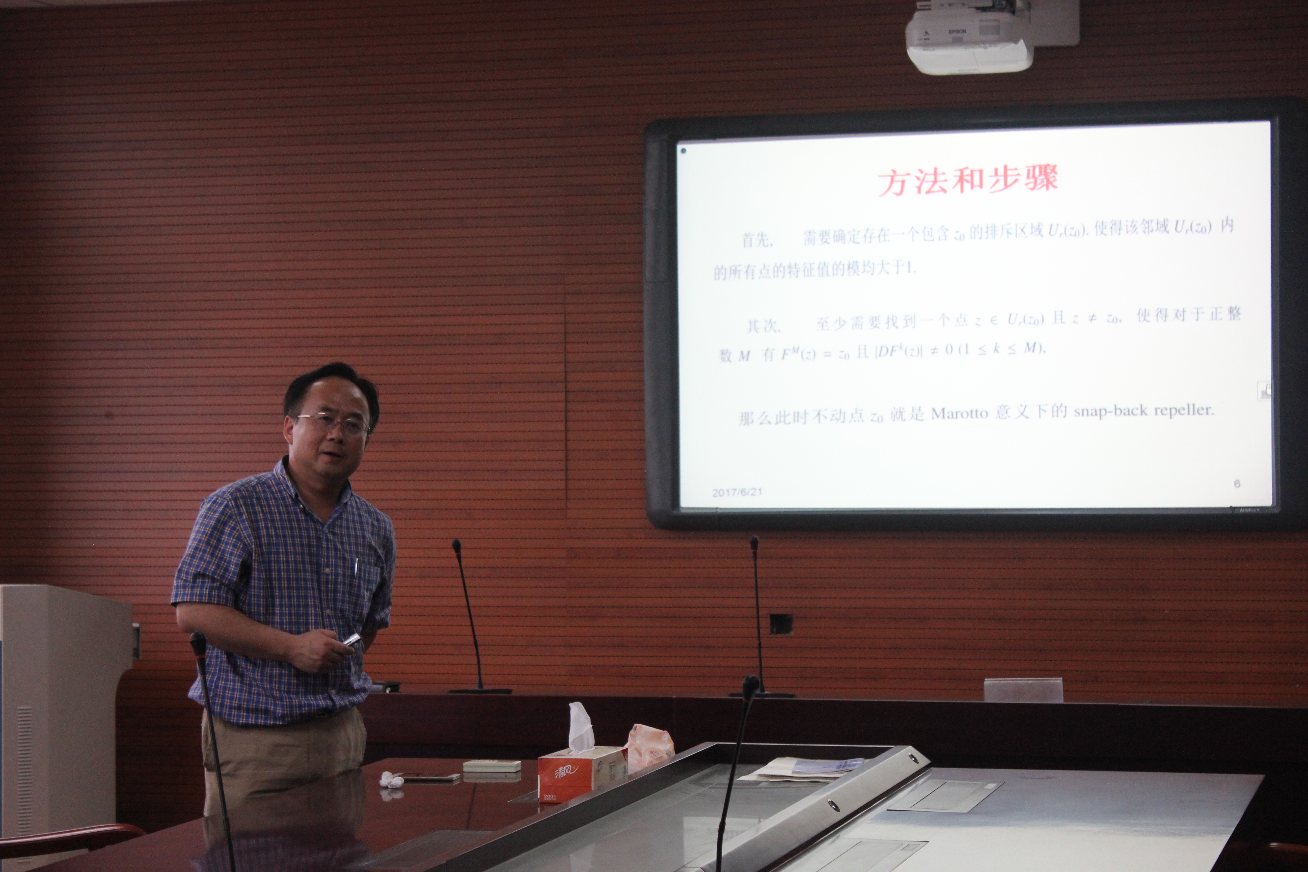 部分教师和学生参加了本次活动。报告中曹鸿钧教授介绍了Marroto定理在证明离散系统发生混沌中的应用,以及应用向前欧拉格式和四阶Runge-Kutta公式,将连续系统转化为离散系统,讨论了双参数平面上离散系统的平衡点、周期解、混沌解的存在区域,这种方法可推广到任意连续系统例如Lorenz族系统的参数平面划分。
