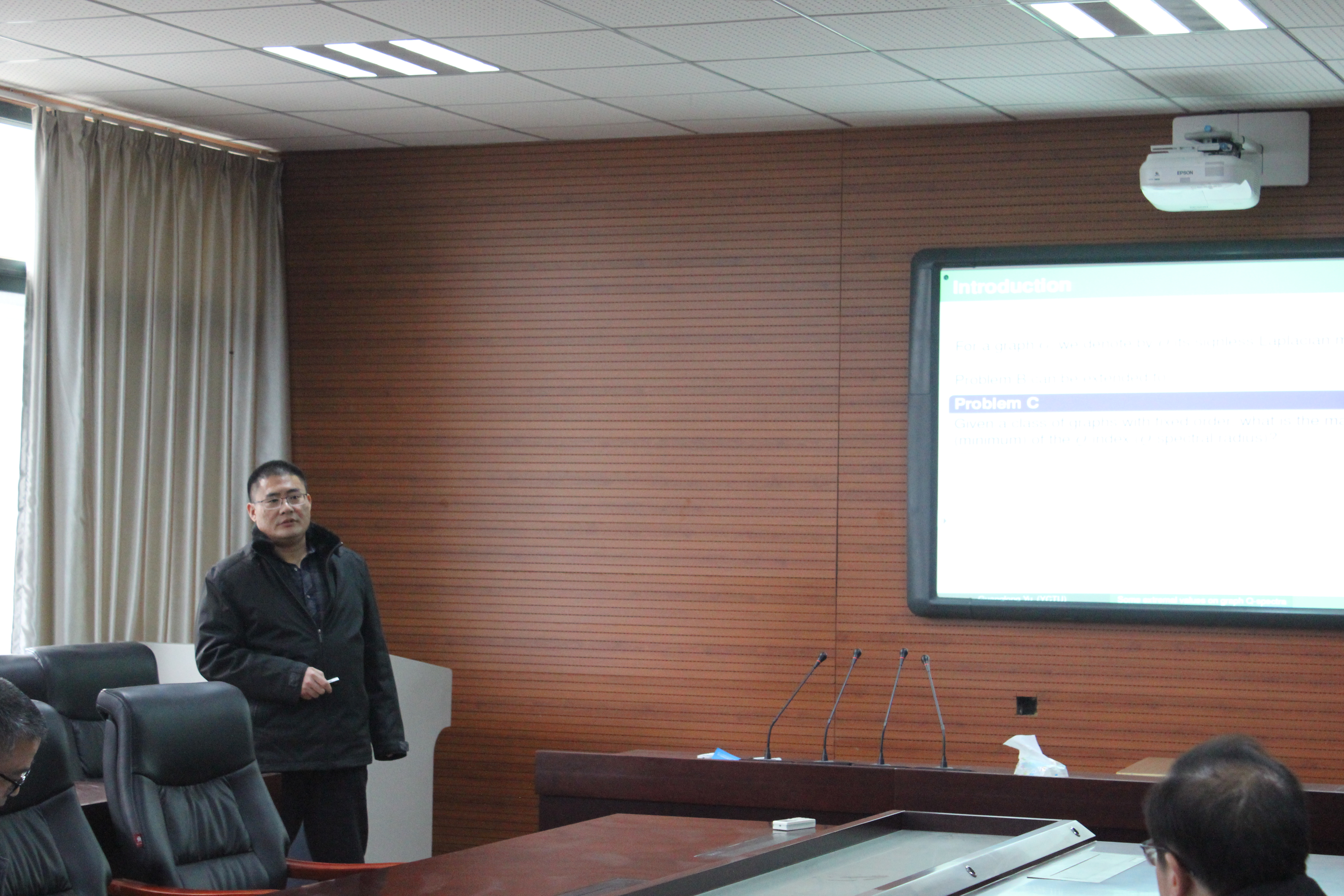 于广龙副教授,做了题为 Some Extremal Values on Graphs Q-spectra 的学术讲座,于广龙副教授是图论与组合优化方向的专家,报告中,他介绍了自己在图论方面的最新研究成果,与大家分享了在Q-spectra上的极值问题。