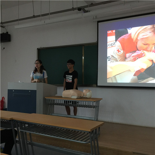 梁赟博士向我们介绍了心肺复苏术操作方法和过程以及日常生活中出现事故的基本处理方法,并在现场进行了急救演练。