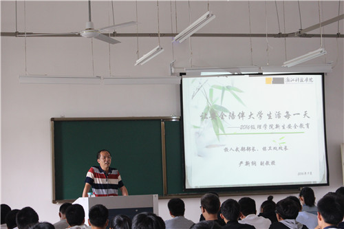 特邀校人武部部长、保卫处处长严新纲副教授,就政治安全、心理安全、卫生安全、交通安全这四大模块对学生展开了多方面的教育,保卫处张淑老师、安吉校区辅导员贾晓龙老师和全体2016级新生聆听了本次讲座。