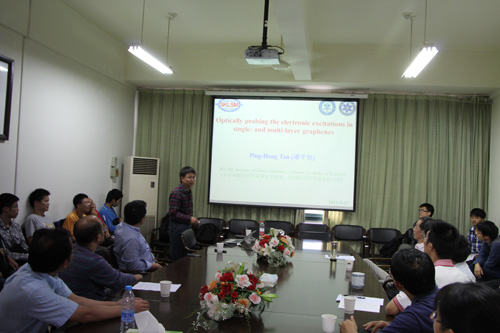 半导体研究所工作,2012年度获国家杰出青年科学基金。谭平恒博士从事碳纳米材料以及半导体低维材料的光学和电学性质研究,至今已在国内外物理期刊发表论文九十余篇,部分论文发表于Nat. Mater ., Nat. Commun. , Phys. Rev. Lett., J. Am. Chem. Soc., Nano Lett., ACS Nano 和Advanced Materials,累计被SCI引用近一千八百余次。现为中科院半导体所学位委员会委员,中国物理学会光散射专业委员会委员和《光散射学报》编委,Proc Natl Acad Sci USA, J. Am. Chem. Soc., Phys. Rev. Lett./Phys. Rev. B, Appl. Phys. Lett. /J. Appl. Phys., 中国科学等国内外核心期刊审稿人。在本次报告中,谭平恒研究员就单层及多层石墨烯中的声子、重参杂费米能级的探测、以及多层石墨烯中毫电子伏量级激发的测量等问题进行了深入地分析和讲解。
