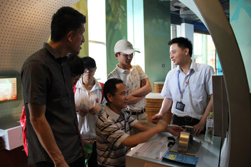 ( 在中医展区,老师们在体验 中医的望诊、问诊、切诊等诊疗手段)