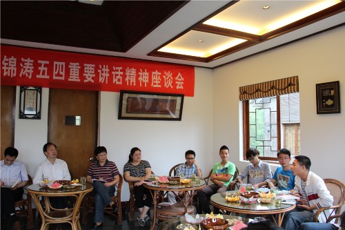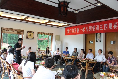 在茗香阁茶楼举办“我们的青春——学习胡锦涛总书记五四重要讲话精神”座谈会。校党委副书记周加敏、校党委宣传部部长陈跃泉、校团委书记姜雯、国产自拍