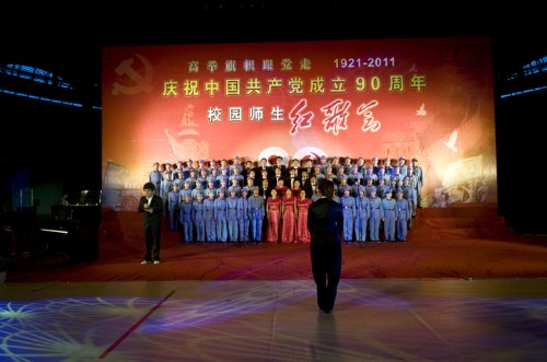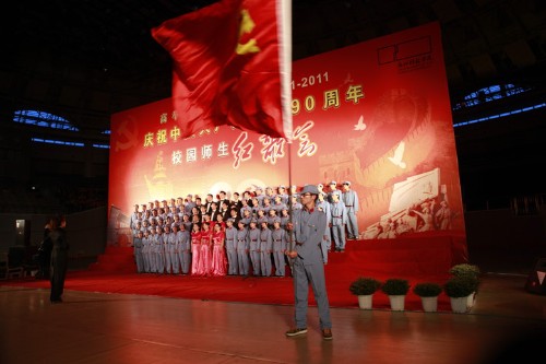 “高举旗帜跟党走”师生红歌会的序幕。校党政领导班子成员及正院级巡视员观看了演出。