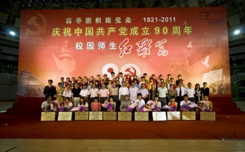 领导班子及系主任、分工会主席、辅导员等老师与学生一起踊跃参加了红歌会。